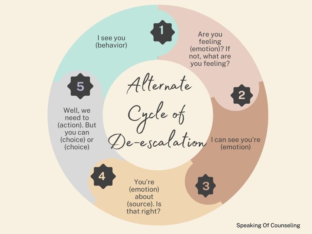 The Alternate Cycle of De-escalation provides a useful structure for parents, teachers, caregivers, volunteers, medical professionals, and others to help de-escalate children, students, and adolescents. This handout creates a reference point as caregivers create new skills of healthier communication and de-escalation.
